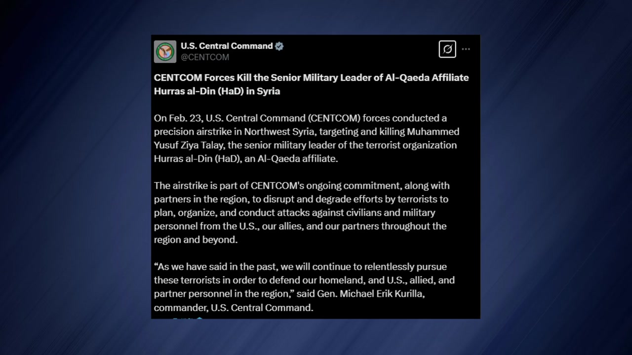 중부사령부는 SNS에 "알카에다 방계 테러 조직인 '후라스 알-딘'의 고위 군사 지도자 무함메드 유수프 지야 탈레이를 겨냥한 정밀 공습을 실시해 그를 살해했다"고 밝혔습니다.