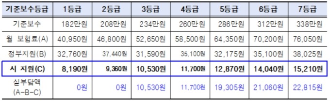 시는 자영업자 고용보험 신규 가입자에게도 5년간 납부 보험료의 20%를 환급하며, 정부 지원과 합산 시 보험료 부담이 70%에서 최대 100%까지 줄어들 수 있다. 예를 들어, 기준보수 1등급 소상공인이 월 보험료 4만950원을 납부할 경우, 서울시와 정부에서 합산해 총 4만950원을 환급받는다.(아래표 참조)