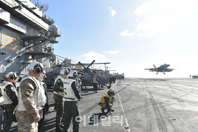 지난 해 1월 15일 칼빈슨함이 한반도에 전개해 한미일 해상훈련을 실시한 가운데, 김명수 합참의장이 칼빈슨함에 올라 항공기 이착륙 등 훈련 상황을 점검하고 있다. (사진=합참) |