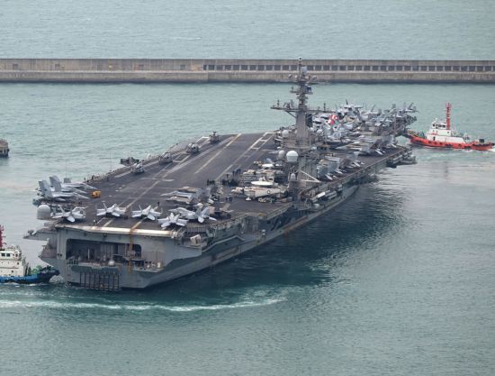 해군은 2일 칼빈슨함 등 미국 해군 제1항모강습단이 2일 부산작전기지에 입항했다고 밝혔다. 칼빈슨함 외에는 순양함 프린스턴(Princeton), 이지스구축함 스터렛(Sterett)도 부산작전기지에 모습을 드러냈다.