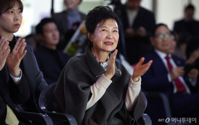 [구미=뉴시스] 박근혜 전 대통령이 14일 오전 경북 구미시 구미코에서 열린 박정희 대통령 탄신 107돌 문화행사에서 박수치고 있다. 2024.11.14. l |