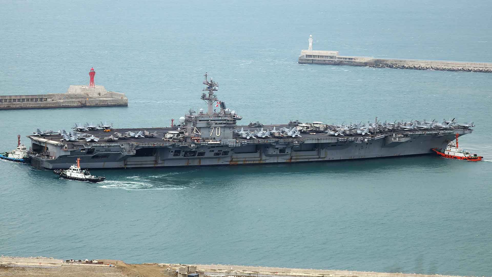 네, 항공모함 칼빈슨함을 비롯한 미 해군 제1항모강습단이 오늘 부산작전기지에 입항했습니다.