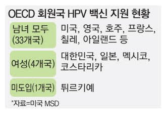 제약업계에 따르면 HPV는 감염돼도 대부분 자연적으로 소멸되지만, 지속적으로 감염이 되면 자궁경부암, 질암, 외음부암, 항문암, 생식기 사마귀 등을 유발한다. 이 때문에 HPV 백신은 '자궁경부암 백신'으로 잘 알려져 국내에서는 여성 청소년과 저소득층 여성을 대상으로 정부가 지원해 무료 접종을 하고 있다.