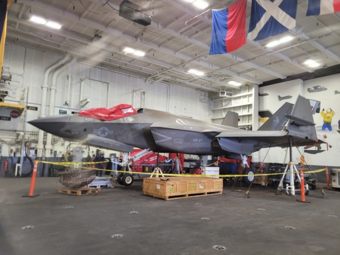 지난 3일 정오 부산 해군작전기지. 미국 해군의 원자력 추진 항공모함 '칼빈슨함'(CVN-70)에 탑승하기 위해 계단을 오르자 갑판에는 소총을 든 군인이 곳곳에 보였다. 긴장감 속 들어선 칼빈슨함 격납고에는 5세대 스텔스 전투기인 F-35C와 4.5세대 전투기인 슈퍼호넷(F/A-18) 등이 웅장한 위용을 뽐내고 있었다.