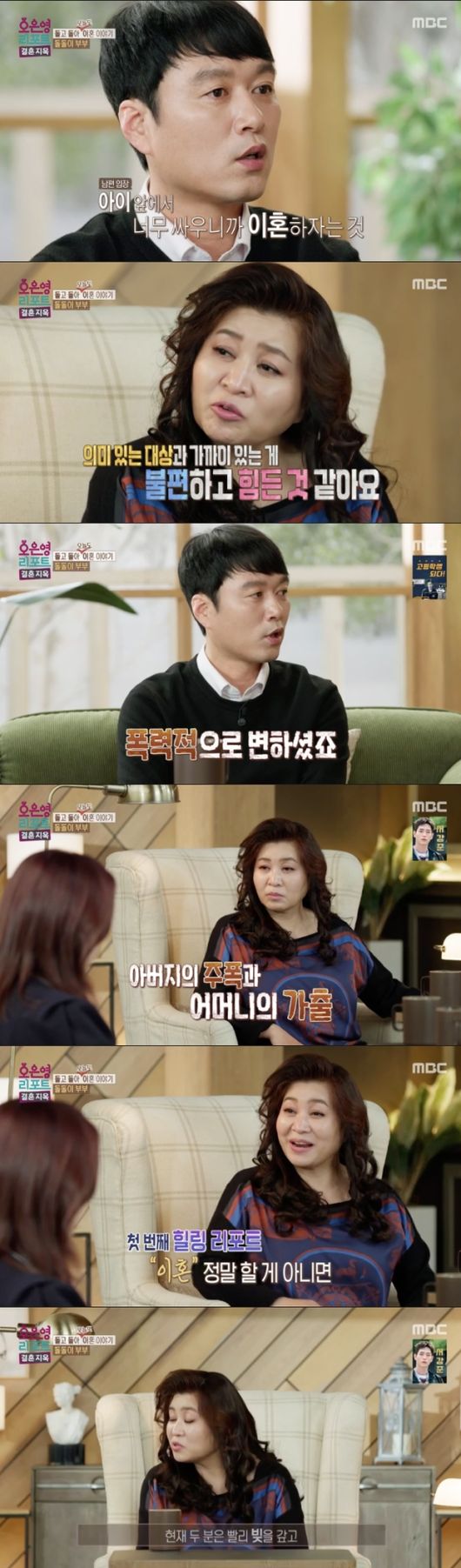 남편은 알코올 중독에 투자 실패로 인한 빚까지 가지고 있었다. 아내는 남편의 음주에 불만을 가졌으며, 빚을 함께 갚자는 제안에는 ‘네 빚은 네가 감당’이라는 식으로 선을 그었다. 남편은 그런 아내에 크게 실망했고 서운한 기색을 내비쳤고, 아내 또한 언제 헤어질지 모르기 때문에 자신도 돈을 모아놔야 한다고 주장했다.