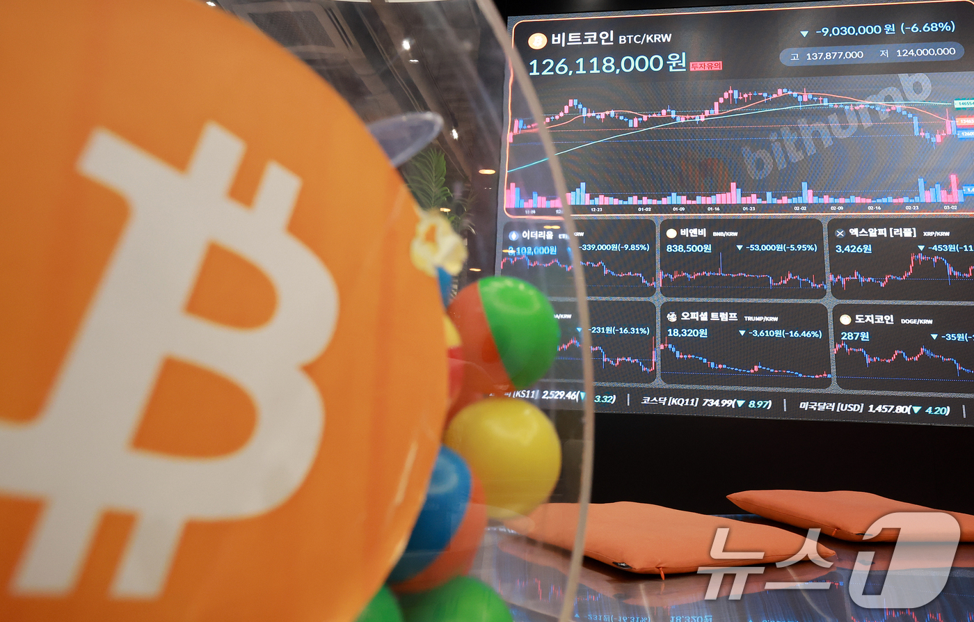 (서울=뉴스1) 김진환 기자 = 4일 서울 서초구 빗썸라운지 전광판에 비트코인 시세가 표시되고 있다. 트럼프의 가상자산 전략 비축 언급으로 급등했던 비트코인이 하루 만에 폭락하며 상승분을 반납했다. 이는 트럼프 행정부의 관세 확대에 따른 불확실성 증가가 원인으로 다른 주요 가상화폐들도 큰 폭으로 하락했다. 2025.3.4/뉴스1