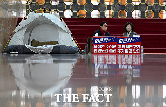 박 의원은 지난 2일 오전 "최상목 대통령 권한대행이 여야 합의 없는 마 후보자를 임명하지 않겠다고 밝힐 때까지 무기한 단식에 돌입하겠다"며 서울 여의도 국회 본관에 텐트를 쳤습니다.