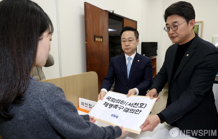[서울=뉴스핌] 윤창빈 기자 = 박성준, 노종면 더불어민주당 의원이 4일 오후 서울 여의도 국회 의안과에서 서천호 국민의힘 의원 제명 촉구 결의안 및 징계요구안을 제출하고 있다. 서천호 국민의힘 의원은 지난 3·1절 윤석열 대통령 탄핵 반대 집회에서 연단에 나와 “헌법재판소를 때려 부숴야 한다”라고 주장했다. 2025.03.04 pangbin@newspim.com