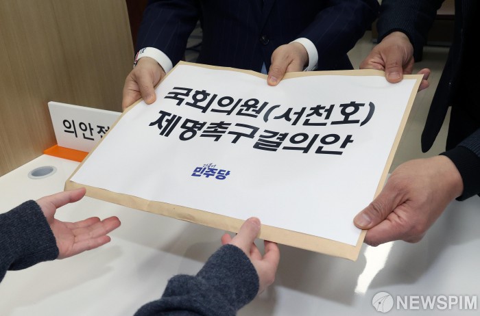[서울=뉴스핌] 윤창빈 기자 = 박성준, 노종면 더불어민주당 의원이 4일 오후 서울 여의도 국회 의안과에서 서천호 국민의힘 의원 제명 촉구 결의안 및 징계요구안을 제출하고 있다. 서천호 국민의힘 의원은 지난 3·1절 윤석열 대통령 탄핵 반대 집회에서 연단에 나와 “헌법재판소를 때려 부숴야 한다”라고 주장했다. 2025.03.04 pangbin@newspim.com