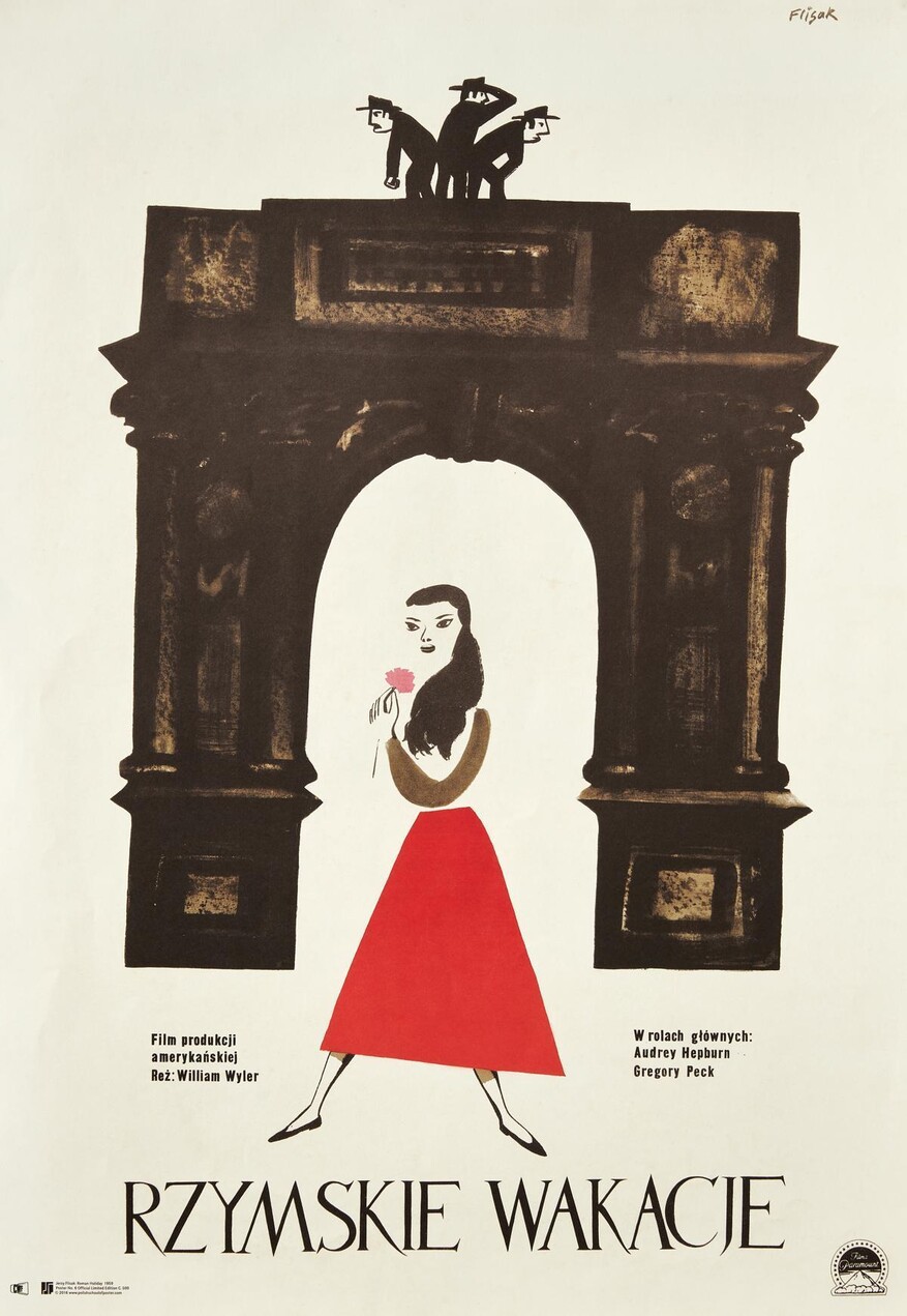 영화 ‘로마의 휴일’(1953)에서 배우 오드리 헵번이 연기한 공주 앤은 경호를 뿌리치고 로마 시내를 활보한다. 개봉 5년 뒤 헵번의 영화 속 용모를 예지 플리삭이란 폴란드 디자이너가 4개의 그림 조각으로 나누어 그려냈다. 갸날픈 발이 달린 빨간 사다리꼴 도형(치마)과 꽃 든 손이 달린 회색빛 획 한점(팔), 길게 내려온 검은빛 덩어리(머리카락), 자유롭고 명징한 헵번의 눈·코·입 윤곽선으로 분할한 이미지들이 나타났다. 이렇게 그려진 헵번이 로마 콘스탄티누스 개선문 아래 서있고, 문 위에 그를 찾으려 두리번거리는 수행원들의 모습을 그려넣은 영화 포스터가 완성됐다. 이는 1960년대 이후 세계 그래픽 디자인 명작으로 길이길이 남게 된다.