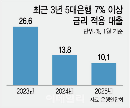 4일 은행연합회 소비자포털에 따르면, 5대 은행(KB국민·신한·하나·우리·NH농협은행)이 지난 1월 취급한 일반 신용대출 중 중금리라 할 수 있는 연 7% 이상 대출은 전체 대출의 약 10%에 그쳤다. 약 90%가 연 6% 미만의 대출이었다. 7% 이상 금리를 적용하는 5대 은행의 대출은 2년 전인 2023년 1월 26.6%에서 작년 1월 13.8%로 반 토막 수준으로 줄었고, 올해 1월 10.1%로 또 감소했다.