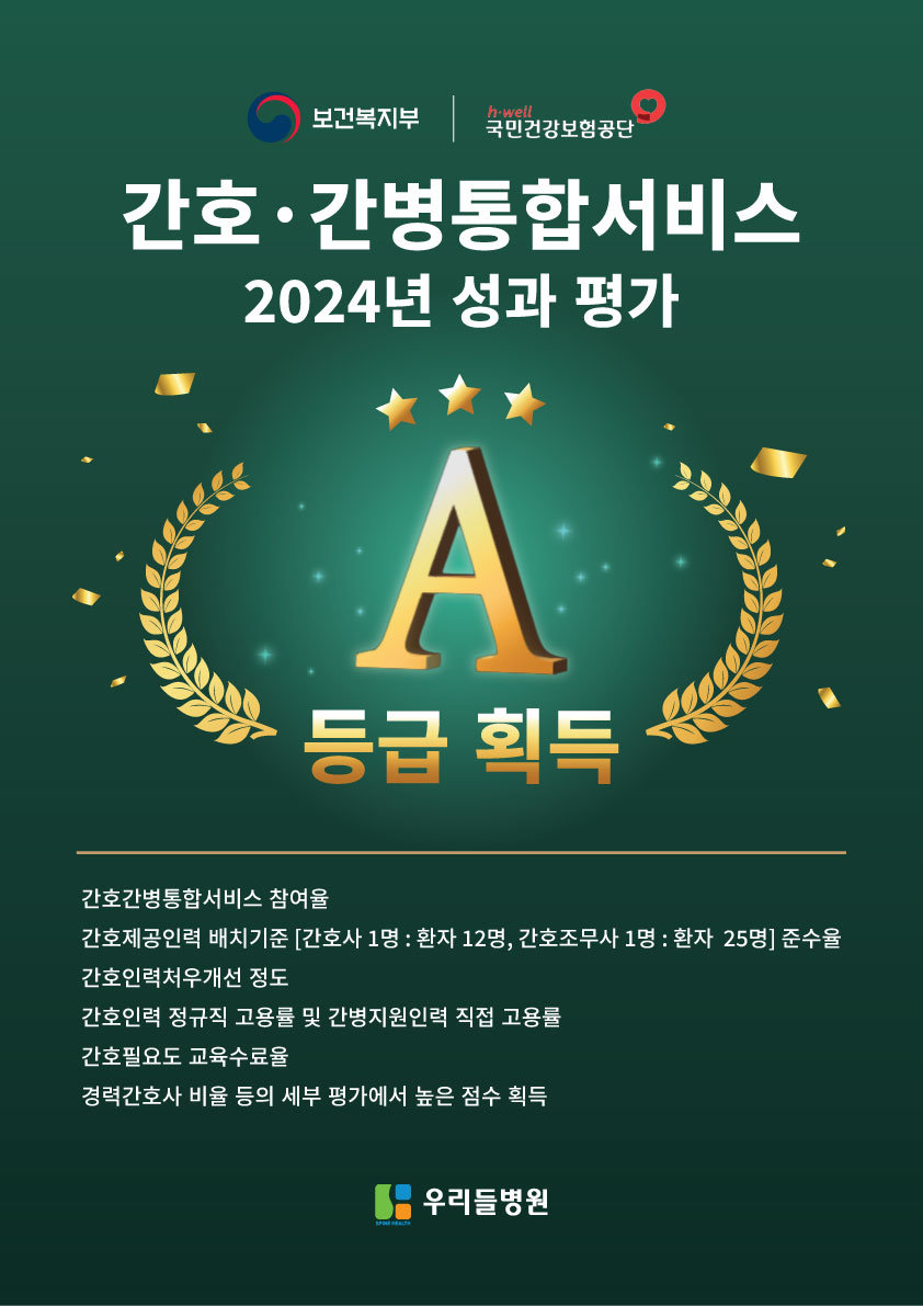우리들병원(병원장 신상하)은 보건복지부 지정의 척추 전문병원으로 2024년 간호·간병통합서비스 성과평가에서 A등급을 받으며 환자들에게 우수한 간호 서비스를 제공하고 전문 간호 역량을 강화하는 의료기관임을 인정받았다.