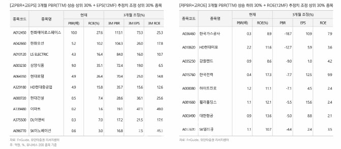 이어 신 연구원은 “공매도 재개 후 가격 부담이 높아진 종목군에 대한 우려가 심화되며 고PBR(주가순자산비율) 대비 저PBR 종목군의 아웃퍼폼이 더욱 확대될 것”이라고 전망했다. 다만 고PBR 종목이라도 밸류 상승의 근거가 이익으로 설명되는 종목에선 견조한 흐름을 보였다.
