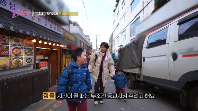 황정음은 “사실 이 집은 사무실로 임대를 줬던 곳이다. 그런데 이혼을 하게 돼 급히 살 집이 필요했고, 때마침 세입자가 나간다고 해서 아이들을 급히 데려와 대충 살고 있다”고 ‘정음적 사고’롤 드러냈다. 직후, 황정음은 거실에서 두 아들과 자다가 눈을 떴다. 든든한 첫째 아들 왕식이, 귀여운 둘째 아들 강식이를 사랑스럽게 바라보던 황정음은 곧장 등교, 등원 준비를 했다. 정신없는 와중에도 황정음은 “아이들이 너무 빨리 크니까 (커가는 모습을) 눈에 다 담고 싶다. 그래서 시간이 있을 때는 무조건 아이들과 함께 한다”며 손을 잡고 등굣길도 함께 했다. 특히 아이들에게 한없이 다정하다가도 엄격할 때는 단호하게 대처해 소신 있는 ‘교육관’을 보여줬다.