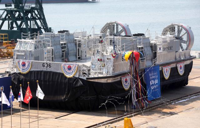 해군 고속상륙정(LSF-Ⅱ) 5·6호정인 '솔개-636·637정'의 진수식이 2023년 5월 17일 오후 부산 영도구 HJ중공업에서 열렸다. 길이 28m, 폭 14m, 높이 8m인 솔개(100t급)는 공기부양 방식으로 움직이기 때문에 해상은 물론 저수심이나 갯벌 지역에서도 고속기동이 가능하다. 부산=뉴시스 |