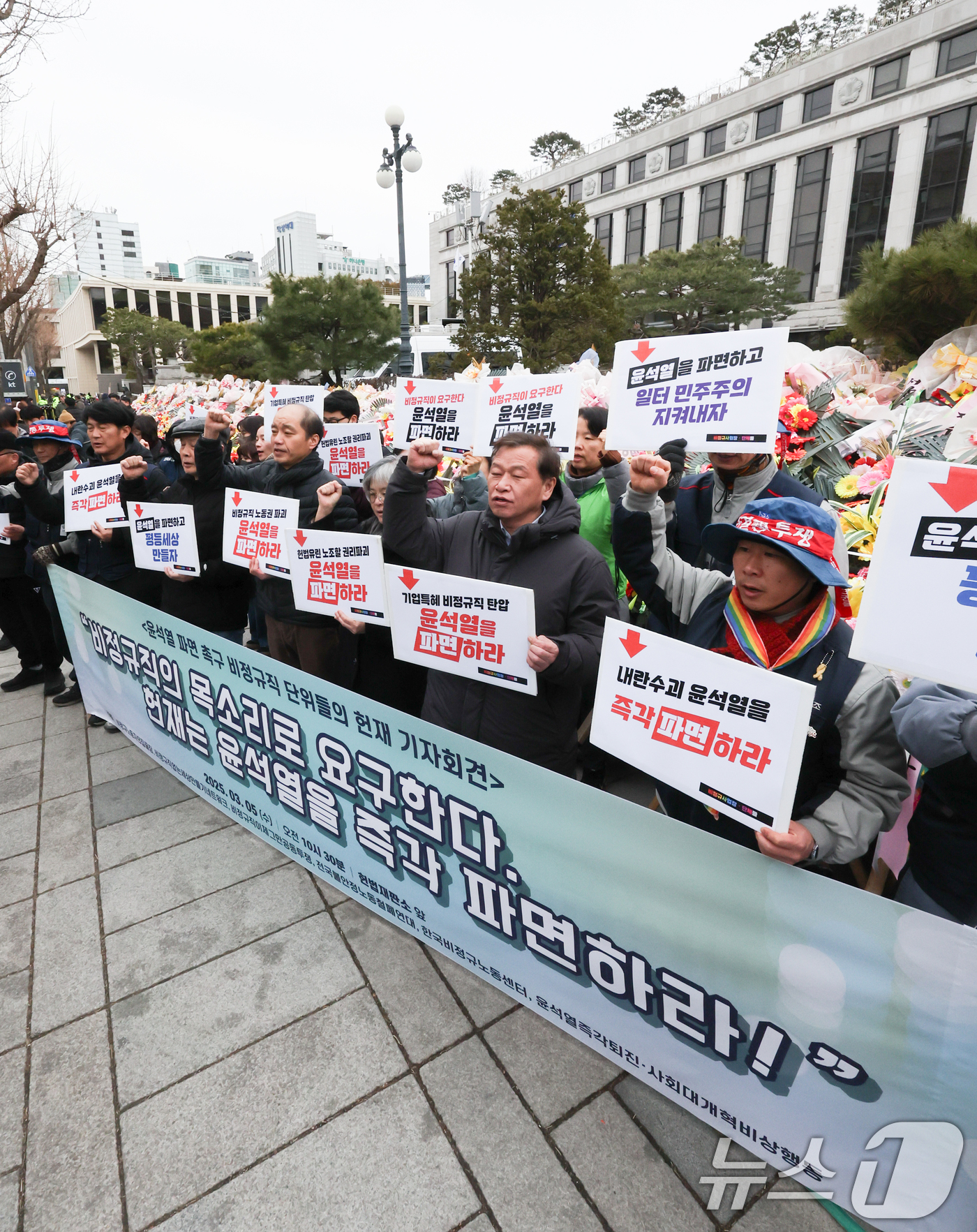 (서울=뉴스1) 허경 기자 = 비정규직없는세상만들기 관계자들이 5일 서울 종로구 헌법재판소 앞에서 기자회견을 열고 윤석열 대통령 파면을 촉구하고 있다. 2025.3.5/뉴스1