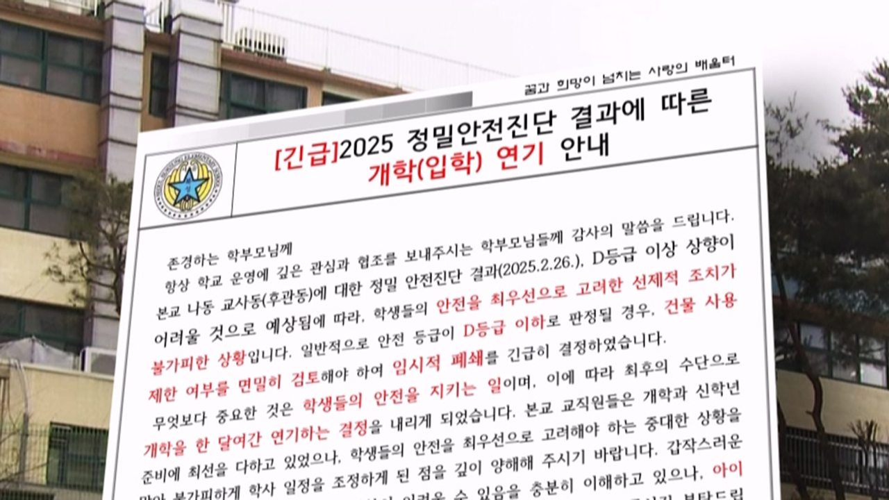 한 초등학교가 개학을 나흘 앞두고 학교 건물 안전에 문제가 있다며 돌연 개학을 4월로 미루겠다고 통보했습니다. 학부모들이 '갑자기 아이를 어디에 맡기라는 거냐'며 반발하면서 학교가 시끄럽습니다.
