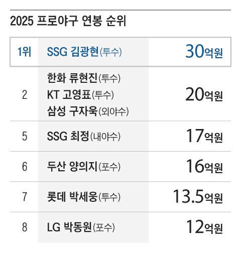 올해 연봉 공동 2위는 고영표(KT), 류현진(한화·이상 투수), 구자욱(삼성)의 20억원이다. 최정(SSG)은 4년 110억원(계약금 30억원·연봉 총액 80억원)짜리 FA 첫 시즌인 올해 연봉 17억원을 받는다. 양의지(두산)가 16억원이다.