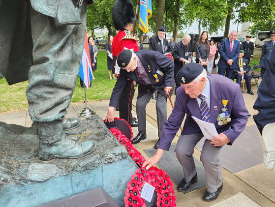 영국 런던 한국전 기념비에 헌화하는 참전용사들. 연합뉴스 |