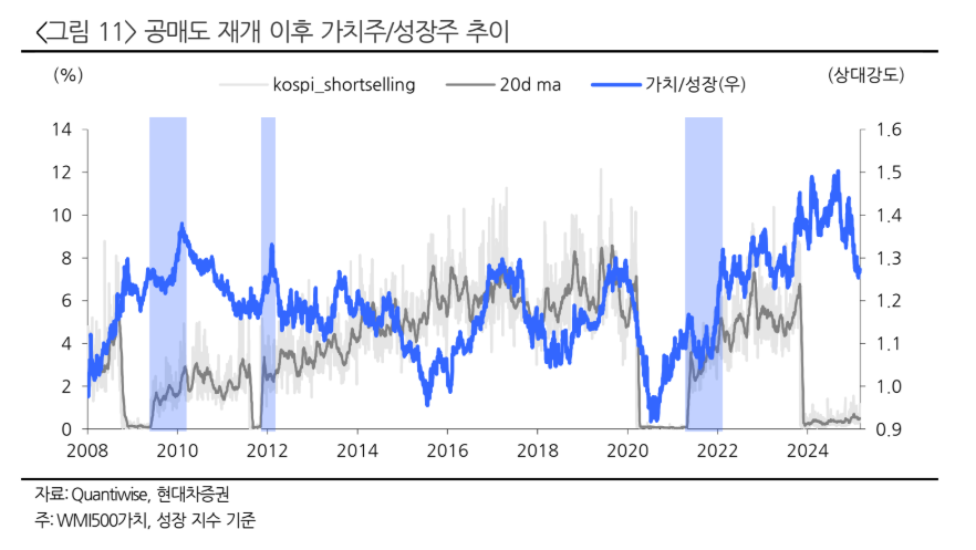 조 연구원은 "쉽게 생각할 수 있는 부분은 밸류에이션이 부담스러운 업종·종목"이라며 "실제로 공매도 재개 이후 단기적으로 성장주 대비 가치주의 상대성과가 개선되는 모습을 확인할 수 있다"고 분석했다.