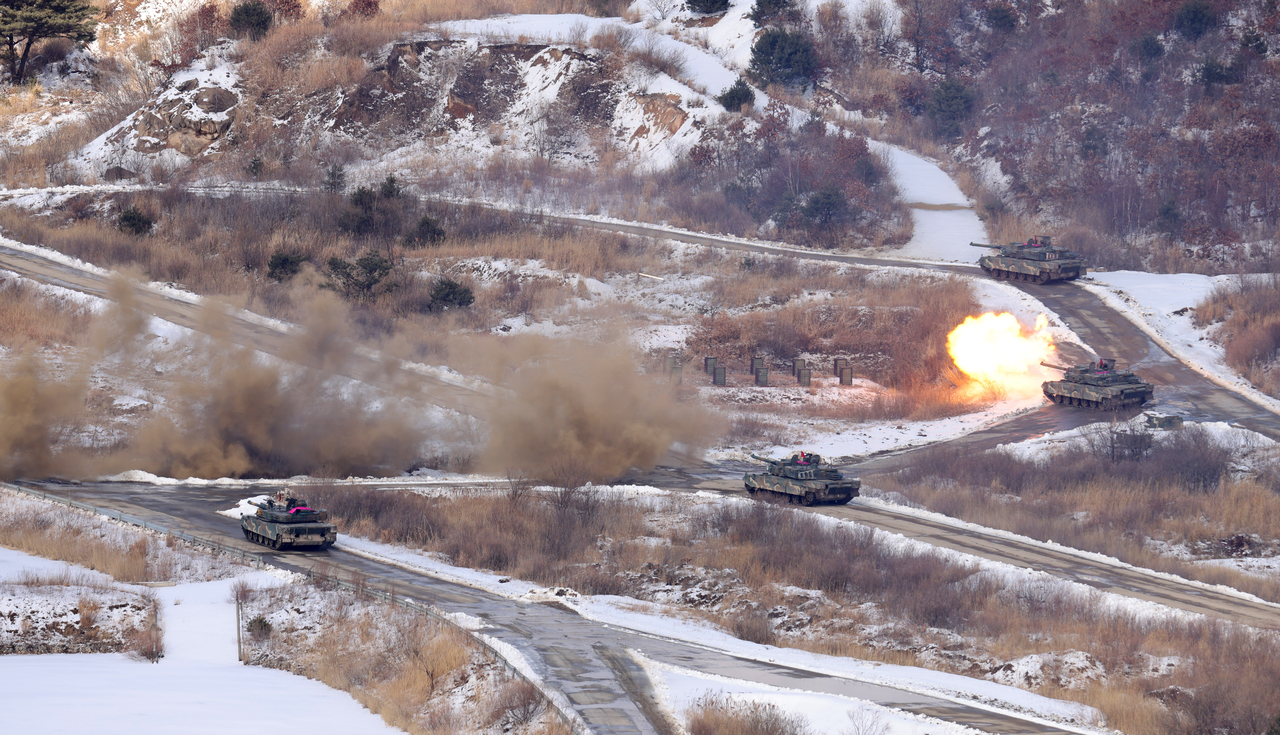 한미 양국군은 6일, 경기도 포천시 소재 승진과학화훈련장에서 2025년 FS연습과 연계한 올해 첫 ‘연합합동 통합화력 실사격 훈련’을 실시했다. 사진은 장애물지대에 통로가 개척되자, 후속 전차와 장갑차들이 초월공격을 시도하는 모습이다.[육군 제공] |