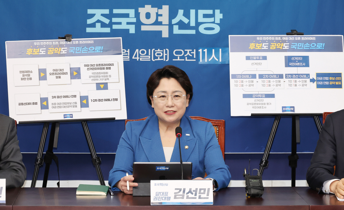 김선민 조국혁신당 대표 권한대행이 지난 4일 국회에서 긴급기자회견을 열고 야5당과 시민사회가 참여하는 완전국민경선(오픈프라이머리)을 제안하고 있다. 연합뉴스 |
