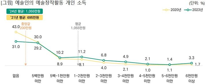 문화체육관광부가 한국문화관광연구원과 6일 발표한 ‘2024년 예술인 실태조사’에 따르면 2023년 예술인 1인당 평균 연소득은 1055만원이었다. 조사 대상 예술인이 속한 가구 1곳당 평균 연소득도 4590만원으로 조사됐다. 우리나라 가구 1곳당 평균 연소득인 6762만원보다 약 2200만원 적은 것이다.