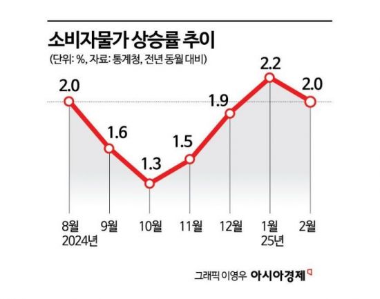 6일 통계청이 발표한 ‘2월 소비자물가동향’에 따르면 지난달 소비자물가지수는 1년 전과 비교해 2.0% 상승했다. 지난 1월(2.2%)에 이어 2개월째 연속 2%대 상승률이 이어진 것이다. 소비자물가 상승률은 지난해 10월(1.3%), 11월(1.5%), 12월(1.9%) 등 3개월 연속 1%대를 이어가다 새해 첫 달(2.2%) 2%대로 반등했었다.