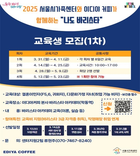 서울시가족센터는 교육생 모집과 사전 교육을 담당하며, 이디야커피는 본사 아카데미 교육장에서 2주 과정의 이론·실습 교육을 무료로 제공한다.