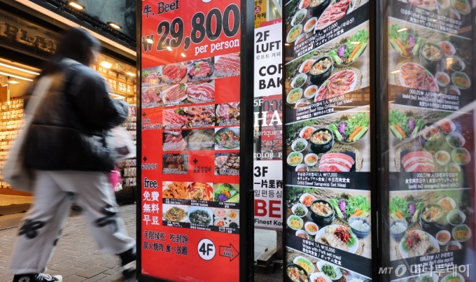 (서울=뉴스1) 김도우 기자 = 퉁계청이 6일 발표한 2월 소비자물가 동향에서 외식과 가공식품 물가 지수가 각각 3.0%, 2.9% 상승한 것으로 나타났다. 이는 전체 소비자물가 지수 상승률(2.0%)보다 높은 수치로, 배달앱의 높은 수수료와 고환율이 가격 상승에 영향을 미친 것으로 보인다. 사진은 6일 서울 시내 한 식당에 메뉴와 가격이 안내되어 있는 모습. 2025.3.6/뉴스1 |