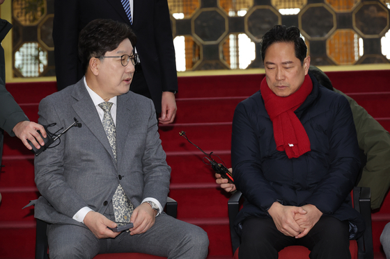권성동 국민의힘 원내대표가 6일 서울 여의도 국회 로텐더홀에서 마은혁 헌법재판관 임명에 반대하며 단식농성을 하고 있는 박수영 의원(오른쪽)을 찾아 대화하고 있다. 〈사진=연합뉴스〉 |
