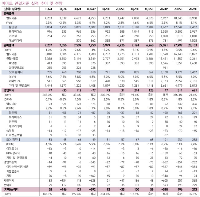 박 연구원은 이마트의 1분기 연결기준 영업이익이 전년 동기 대비 956억원 늘어난 1427억원으로 시장 기대치를 웃돌 것으로 전망했다. 할인점과 SCK컴퍼니 중심 전사 고정비 절감, G마켓글로벌의 지분법 손익 분류에 따른 영업적자 및 PPA 상각비 축소(257억원) 등의 영향이다.