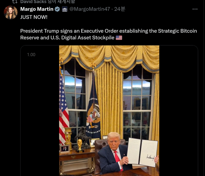삭스는 자신의 X(옛 트위터에) “불과 몇 분 전 트럼프 대통령은 전략적 비트코인 준비금을 설립하는 행정명령에 서명했다”면서 “이 행정명령은 미국을 ‘세계의 암호화폐 수도’로 만들겠다는 트럼프 대통령의 의지를 보여준다”고 말했다.
