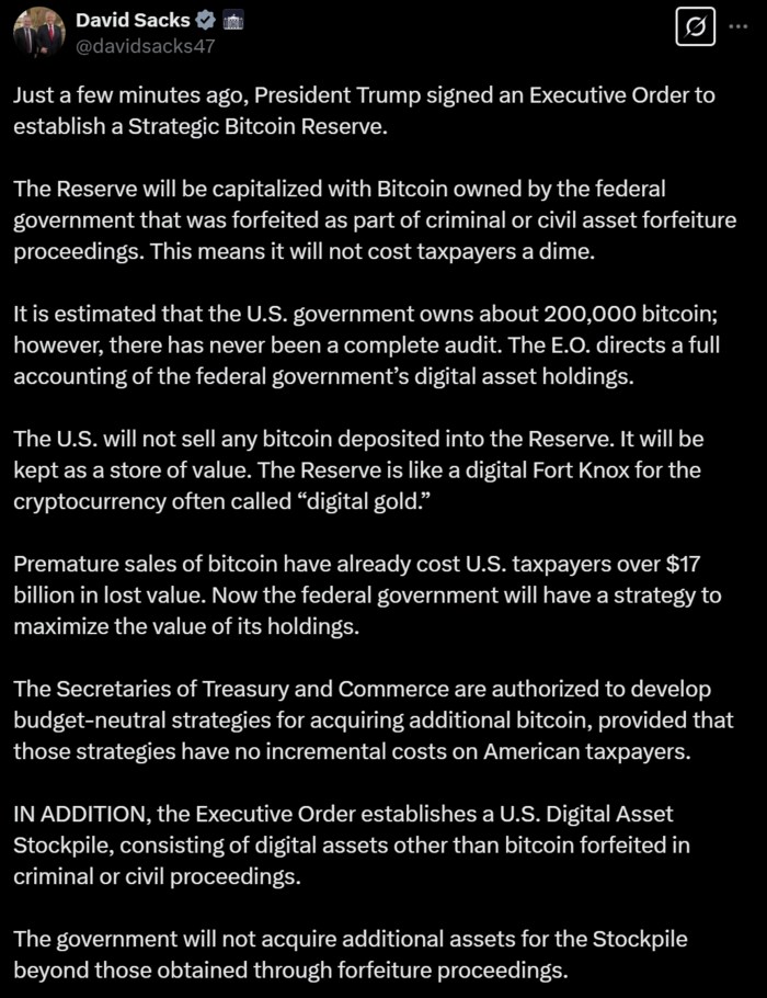 데이비드 색스 백악관 가상자산 정책 책임자(크립토 차르)는 본인의 X(구 트위터)에서 “트럼프 대통령이 비트코인 전략 비축을 구성하기 위한 행정명령에 서명했다”고 밝혔다.
