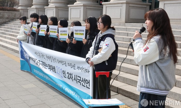[서울=뉴스핌] 양윤모 기자 = 7일 오후 서울 동대문구 이문동 한국외국어대학교에서 한국외대시국선언참가단 소속 학생들이 윤석열 대통령 즉각 파면을 촉구하는 200인 2차 시국선언 기자회견을 하고 있다. 이번 행사는 박서영 학생의 사회로 강민서,이민지,장유진,김민지,조세연 학생들의 발언과 시국선언문을 낭독했다. 2025.03.07 yym58@newspim.com