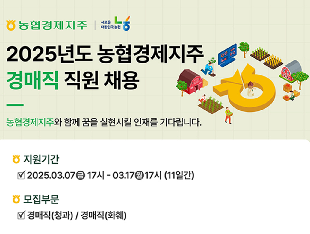 농협경제지주가 '2025년 상반기 경매직 신규직원 공개채용'을 실시한다고 7일 밝혔다.