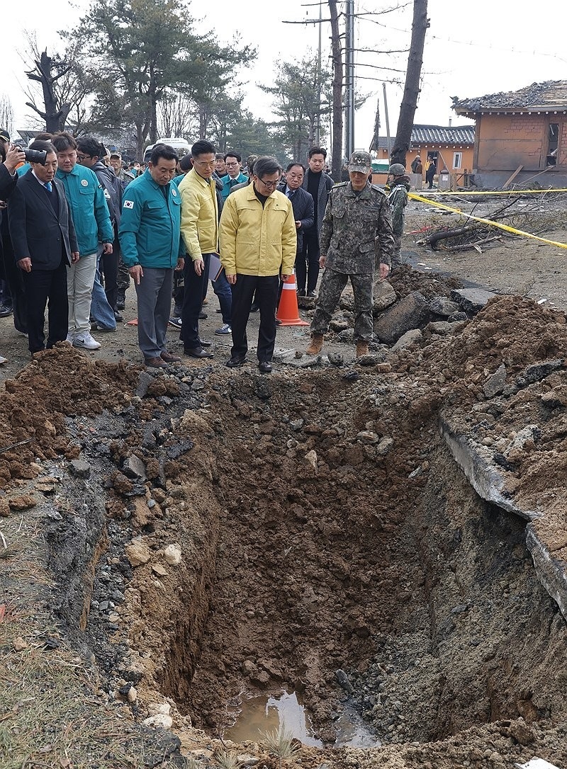 7일 김동연 경기도지사(오른쪽에서 두 번째)가 경기도 포천시 이동면 노곡리 공군 전투기 오폭 사고 현장에서 폭탄이 떨어진 지점을 살펴보고 있다. 연합뉴스 제공 |