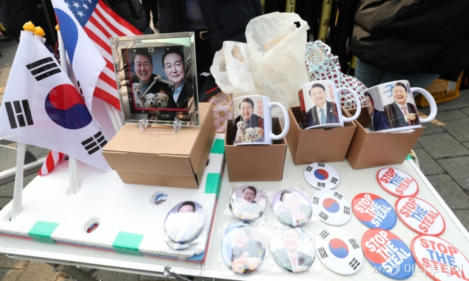 (서울=뉴스1) 권현진 기자 = 법원이 내란 수괴 혐의로 구속기소된 윤석열 대통령의 구속 취소를 인용한 7일 서울 용산구 한남동 대통령 관저 인근에 윤대통령의 석방을 환영하는 시계와 머그컵등이 놓여 있다. 2025.3.7/뉴스1 Copyright (C) 뉴스1. All rights reserved. 무단 전재 및 재배포, AI학습 이용 금지. /사진=(서울=뉴스1) 권현진 기자 |