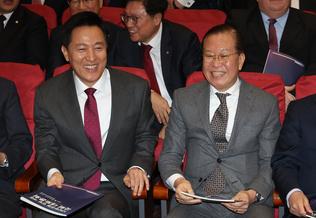 권영세 국민의힘 비상대책위원장과 오세훈 서울시장이 7일 서울 여의도 국회 의원회관에서 열린 지방분권형 헌법 개정 국회 대토론회에서 웃고 있다. 뉴시스 |