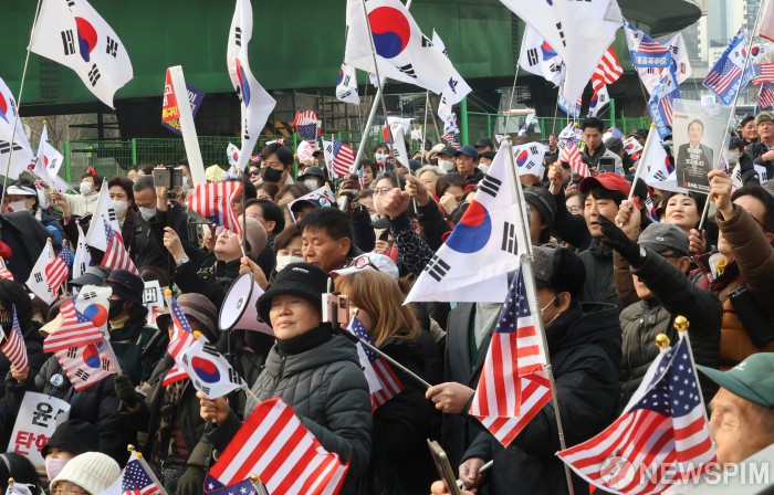 태극기 흔들며 윤석열 대통령의 구속 취소 환영