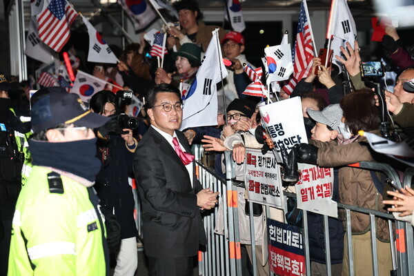 7일 국민의힘 윤상현 의원이 경기도 의왕시 서울구치소 앞에서 윤석열 대통령 지지자들과 인사를 하고 있다. 의왕=연합뉴스 |