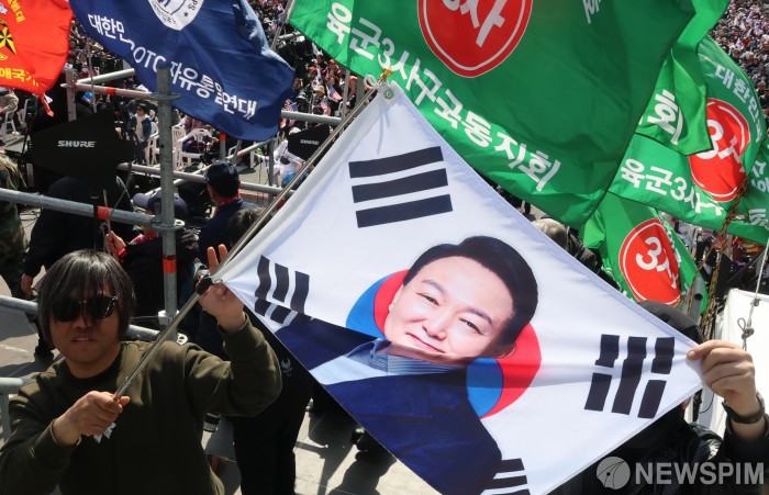 [서울=뉴스핌] 양윤모 기자 = 법원이 윤석열 대통령 구속 취소 청구를 인용한 뒤 주말인 8일 오후 서울 세종대로 일대에서 전광훈 사랑제일교회 목사를 주축으로 한 자유통일당이 윤 대통령 탄핵을 반대하는 '자유통일을 위한 국민대회'가 개최된 가운데 한 참가자가 윤석열 태극기와 기념촬영을 하고 있다. 2025.03.08 yym58@newspim.com