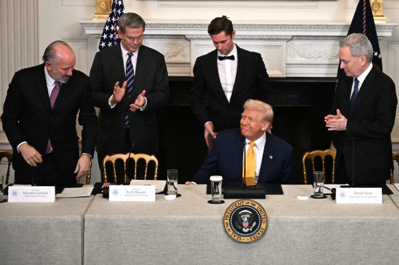 도널드 트럼프(오른쪽 두번째) 미국 대통령이 미국 상무부 장관 하워드 루트닉(왼쪽 첫번째), 미국 재무부 장관 스콧 베센트(왼쪽 두번째), 백악관 인공지능(AI) 및 가상화폐 차르 데이비드 삭스(오른쪽 첫번째))와 함께 7일(현지시간) 미국 워싱턴 DC에서 열린 가상화폐 정상회담에 참석하고 있다. AFP 연합뉴스 |