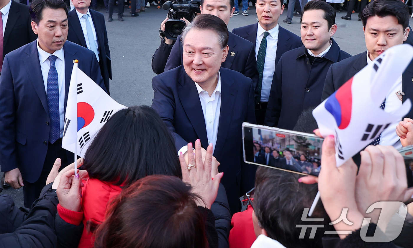 (서울=뉴스1) 김성진 기자 = 법원의 구속취소 청구 인용으로 석방된 윤석열 대통령이 8일 오후 서울 용산구 한남동 대통령 관저 앞 지지자들과 인사하고 있다. 윤 대통령은 내란 우두머리 혐의로 지난 1월 26일 구속기소 된 지 41일 만, 1월 15일 체포된 후 52일 만에 자유의 몸이 됐다. 2025.3.8/뉴스1