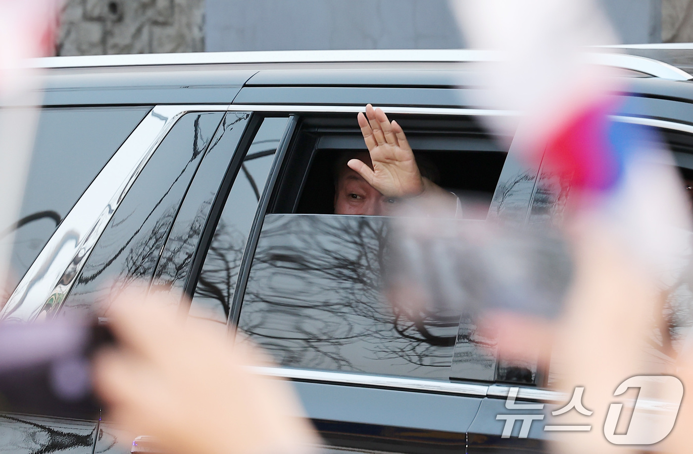 (서울=뉴스1) 김성진 기자 = 법원의 구속취소 청구 인용으로 석방된 윤석열 대통령이 8일 오후 서울 용산구 한남동 대통령 관저 앞 지지자들을 향해 인사하고 있다. 윤 대통령은 내란 우두머리 혐의로 지난 1월 26일 구속기소 된 지 41일 만, 1월 15일 체포된 후 52일 만에 자유의 몸이 됐다. 2025.3.8/뉴스1
