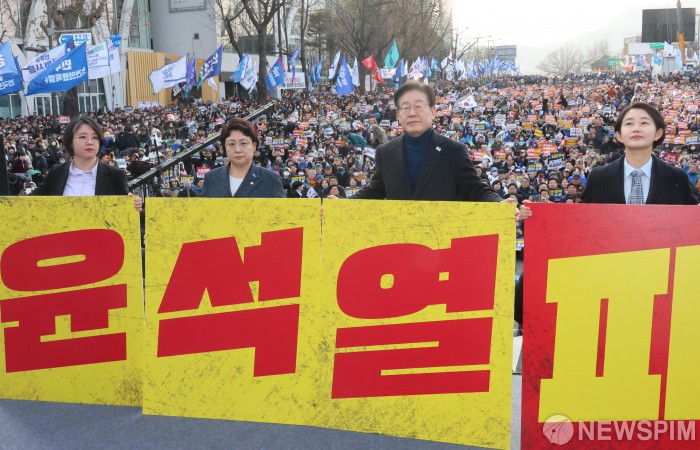 [서울=뉴스핌] 양윤모 기자 = 법원이 윤석열 대통령 구속 취소 청구를 인용한 뒤 주말인 8일 오후 서울 안국동 사거리에서 열린 '야5당 공동 내란종식·민주헌정수호를 위한 윤석열 파면 촉구 범국민대회'에서 이재명 더불어민주당 대표, 조국혁신당 김선민 당 대표 권한대행 등 참가자들이 퍼포먼스를 하고 있다. 2025.03.08 yym58@newspim.com