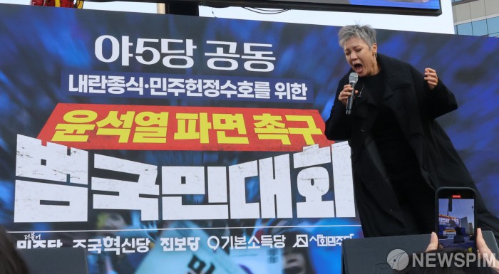 [서울=뉴스핌] 양윤모 기자 = 법원이 윤석열 대통령 구속 취소 청구를 인용한 뒤 주말인 8일 오후 서울 안국동 사거리에서 열린 '야5당 공동 내란종식·민주헌정수호를 위한 윤석열 파면 촉구 범국민대회'에서 가수 이은미가 공연을 하고 있다. 2025.03.08 yym58@newspim.com