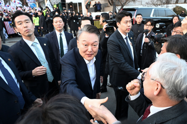 윤석열 대통령이 8일 석방된 후 서울 용산구 관저 앞에 모인 지지자들과 인사를 나누고 있다.