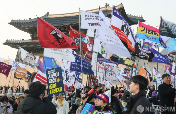 [서울=뉴스핌] 양윤모 기자 = 검찰 비상계엄 특별수사본부(본부장 박세현 서울고검장)가 8일 오후 윤 대통령에 대한 석방 지휘서를 서울구치소에 송부한 가운데, 윤석열 즉각퇴진·사회대개혁 비상행동이 서울 광화문 동십자각 근처에서 윤석열 탄핵을 위한 '14차 범시민대행진'을 개최하며 검찰의 윤석열 석방을 규탄하는 집회를 열고 있다. 2025.03.08 yym58@newspim.com