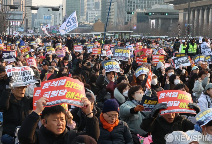 [서울=뉴스핌] 양윤모 기자 = 검찰 비상계엄 특별수사본부(본부장 박세현 서울고검장)가 8일 오후 윤 대통령에 대한 석방 지휘서를 서울구치소에 송부한 가운데, 윤석열 즉각퇴진·사회대개혁 비상행동이 서울 광화문 동십자각 근처에서 윤석열 탄핵을 위한 '14차 범시민대행진'을 개최하며 검찰의 윤석열 석방을 규탄하는 집회를 열고 있다. 2025.03.08 yym58@newspim.com